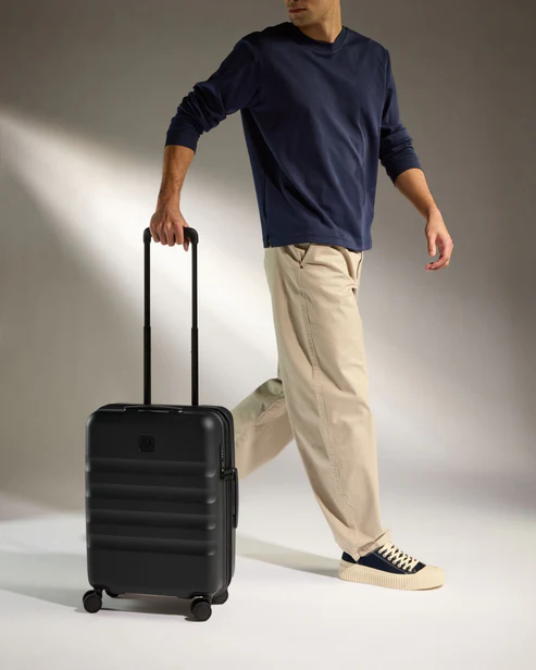 Experience unrestricted movement with our design combination of Silent Glide 360 spinner wheels and bespoke comfort-grip handle. The compact yet spacious fully recycled interior lining, featuring double-zip pockets and compression straps, provides ample space for your belongings.